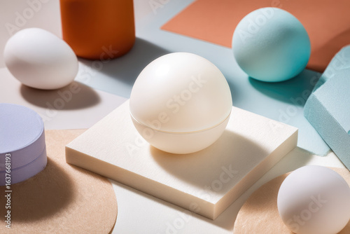 Fototapeta premium Minimalist round container soft pastel background geometric shapes modern...