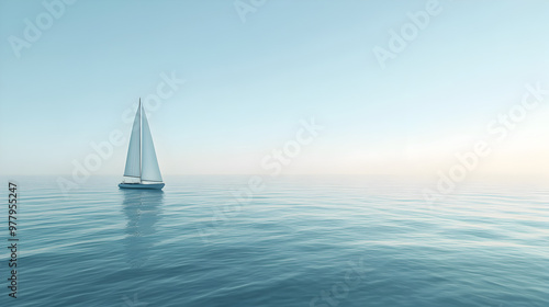 Obraz premium Minimalist sailboat in the distance on calm waters with endless horizon and...