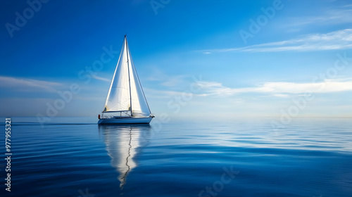 Obraz premium Minimalist sailboat in the distance on calm waters with endless horizon and...