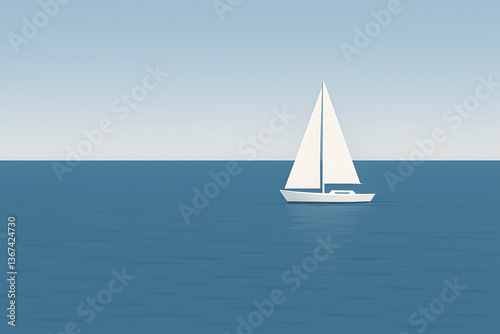 © Sebastian, Obraz premium Minimalist sailboat on calm sea with clear sky and blue horizon