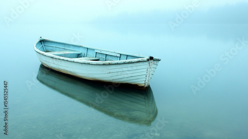© Yoonnam, Naklejka premium Minimalist scene of a single white boat floating on calm water at dawn. Soft pastel sky reflects on the still surface. Peaceful solitude, early morning light, caption space on the side.
