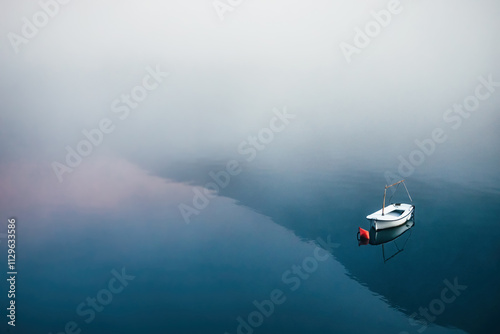 © EdNurg, Naklejka premium Minimalist seascape featuring a small white boat on calm water with dense fog, pink and blue reflections, creating a serene and mysterious atmosphere
