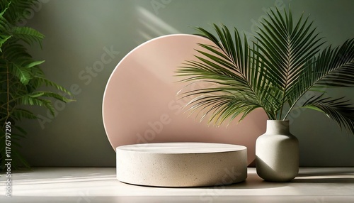 © sala, Fototapeta premium Minimalist setup with a round podium and a vase with palm leaves.