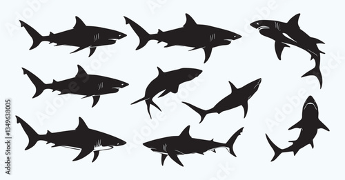 Fototapeta premium Minimalist Shark Silhouette Set – Vector Black Shark Icons on White Background
