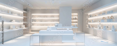 Fototapeta premium Minimalist shop background with clean white shelves, geometric displays, and soft lighting.