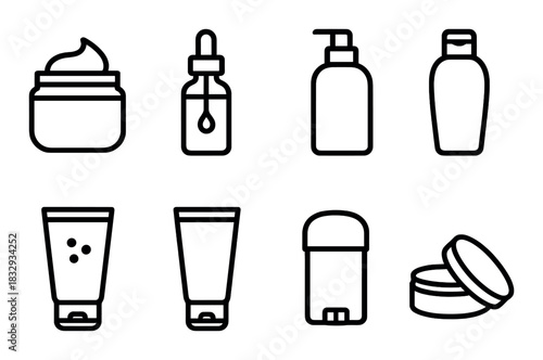 Fototapeta premium Minimalist skincare product icons: bottles, jars, tubes, dispenser, cream