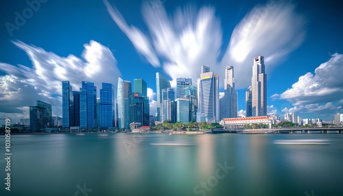Fototapeta premium Minimalist skyline, dramatic clouds swirling, vibrant colors reflecting...
