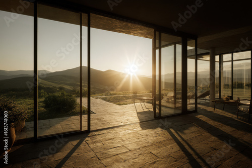 © Natia, Obraz premium minimalist smart home featuring large that beautifully frame morning light