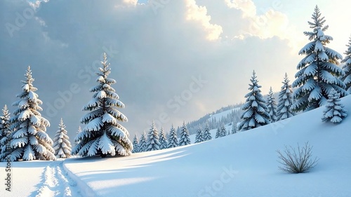 © Adisorn, Naklejka premium Minimalist Snowy Hill Pine Trees AI Art, Winter Landscape, Depth, Mood, Lighting, Atmosphere, Style, Quality