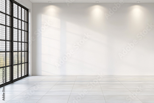 Fototapeta premium Minimalist spacious room with large window casting sunlight on white walls...