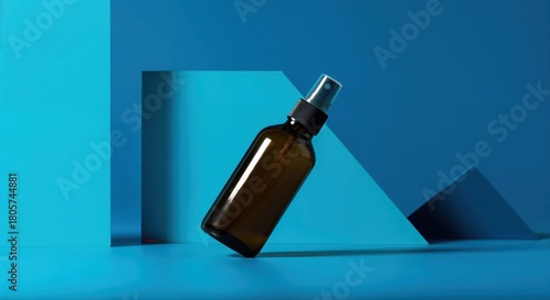 Fototapeta premium Minimalist Spray Bottle in Blue Composition: A close-up shot of a brown spray...