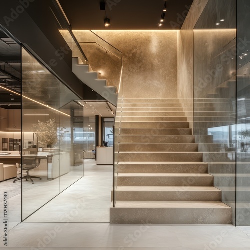 Obraz premium Minimalist Staircase Office Interior with Illuminated Glass Steps and...