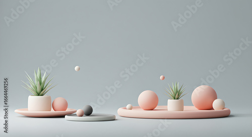 © Phat, Fototapeta premium Minimalist Studio Scene with Pastel Trays, Geometric Spheres, and Green Plants on a Grey Background