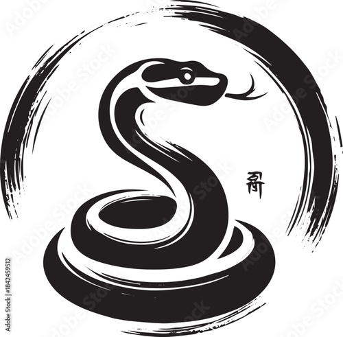 © Orion Draw, Fototapeta premium Minimalist sumi-e illustration of a snake coiled within a brushs