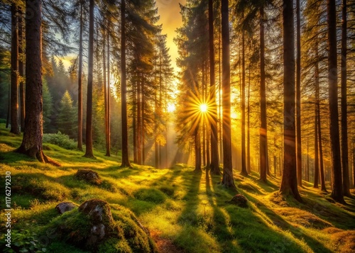 Fototapeta premium Minimalist Summer Sunset: Golden Rays Filtering Through Mountain Forest