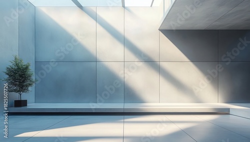 © lucky, Obraz premium Minimalist sunlit concrete atrium with raised bench, single potted tree and long diagonal shadows, calm serene modern interior
