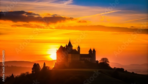 © Arnada, Obraz premium Minimalist Sunset Silhouette: Majestic Castle at Golden Hour