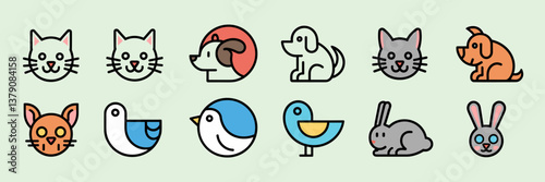 Fototapeta premium Minimalist vector animal icon set featuring cats, dogs, birds, and rabbits in...