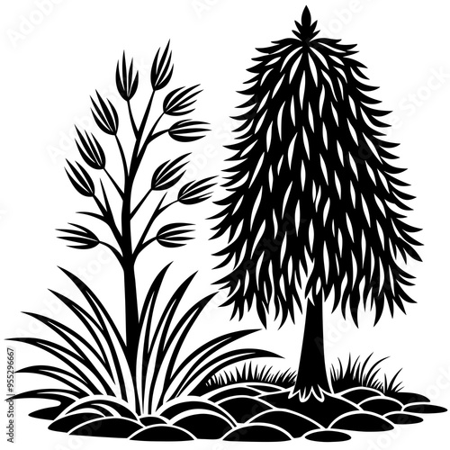 Obraz premium Minimalist Vector Art Pine Tree, Willow Tree, and Flowing Grass