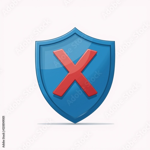 Obraz premium Minimalist Vector Design White Background with Cartoon-Style Blue Safety Shield and Red X Mark for Security Alert