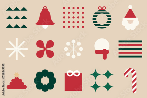 © Rawpixel.com, Obraz premium Minimalist vector set with Christmas icons in red, green, and white. Simple vector style with geometric shapes and festive concept. Aesthetic flat graphic illustration festive holiday element set.