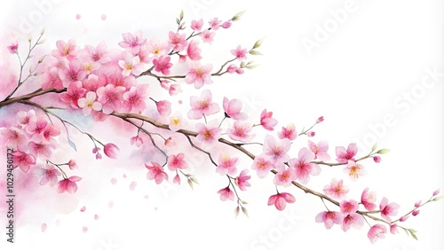 © beng, Naklejka premium Minimalist watercolor painting of delicate pink cherry blossoms on white background