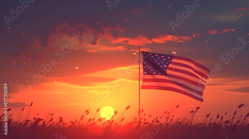 Obraz premium Minimalist Waving American Flag Design at Sunset Backdrop