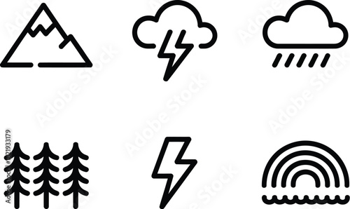 © Clinton Black, Naklejka premium Minimalist weather and nature line icon set featuring mountain, storm, rain, forest, lightning, and rainbow symbols for graphic design