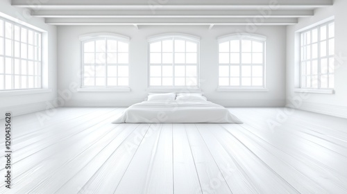 Obraz premium Minimalist white bedroom with large windows and wooden floor.