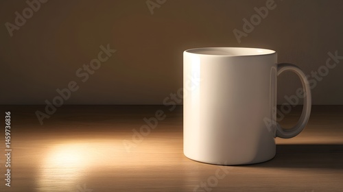 © Abida, Obraz premium Minimalist White Ceramic Mug with Warm Ambient Lighting – Cozy Product Shot