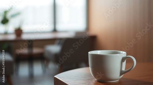 Obraz premium Minimalist White Coffee Cup on a Wooden Table in a Sunlit Modern Cafe Interior