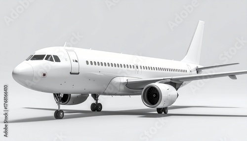 Obraz premium Minimalist white commercial jet on neutral background, side view, no branding.