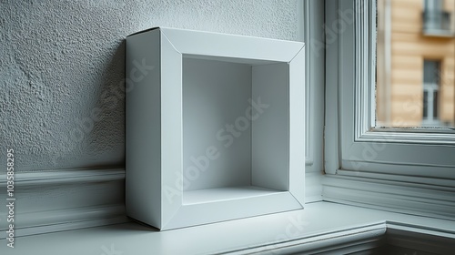 Fototapeta premium Minimalist white cube shelf by a window, capturing natural light.