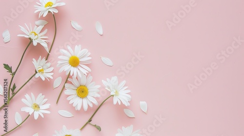 © 波 刘, Naklejka premium Minimalist White Daisy Chamomile on Pale Pink Background: Petal Contrast, Soft Aesthetic, and Floral Design Harmony