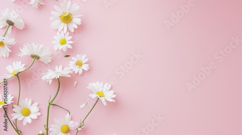 © 波 刘, Naklejka premium Minimalist White Daisy Chamomile on Pale Pink Background: Petal Contrast, Soft Aesthetic, and Floral Design Harmony