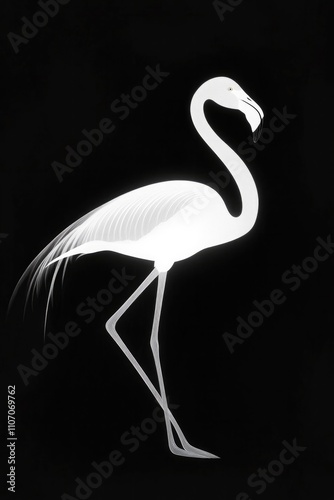 © Irina B, Fototapeta premium Minimalist white flamingo silhouette on a black background, ideal for modern posters, decor, or nature-inspired designs with a contemporary twist..