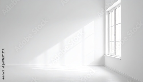 © ntuydai, Obraz premium Minimalist White Interior Space with Soft Natural Light Streaming Through a Large Window Casting Dramatic Shadows