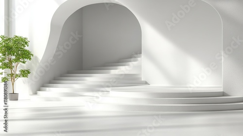 Obraz premium Minimalist white interior with curved staircase and plant.