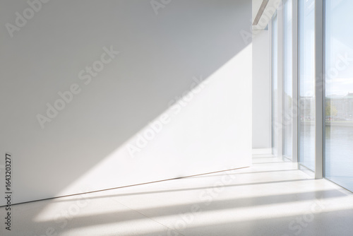 © Halal Vision Studio, Obraz premium Minimalist White Interior with Sunlight Streaming Through Corner Window
