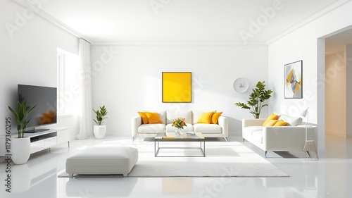 Fototapeta premium Minimalist White Living Room with Yellow Accent - AI Photo