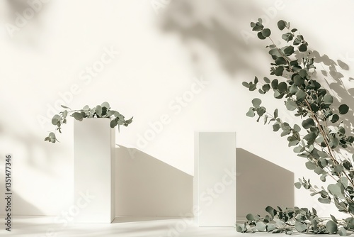Fototapeta premium Minimalist White Pedestal Displays, Eucalyptus Branches, Neutral Backdrop