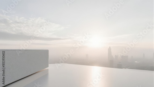 © harryaishi, Obraz premium Minimalist White Rooftop with Cityscape View at Sunset.