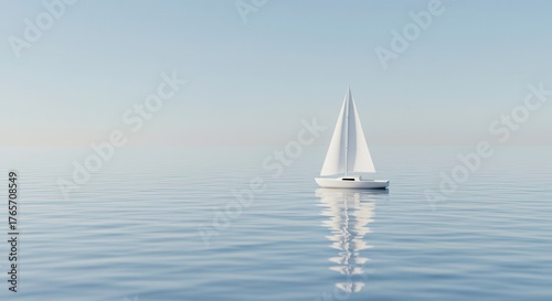 © Hungarian, Obraz premium Minimalist white sailboat glides across calm, blue waters under a pale sky.