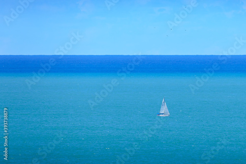 Obraz premium Minimalist: white sailboat in turquoise and blue seas