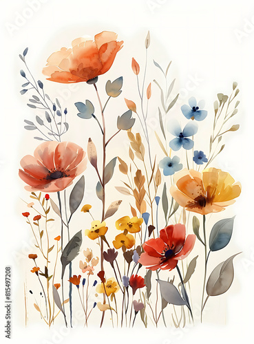 Fototapeta premium minimalist wildflower watercolor painting, eadow with ixed flowers Illustration