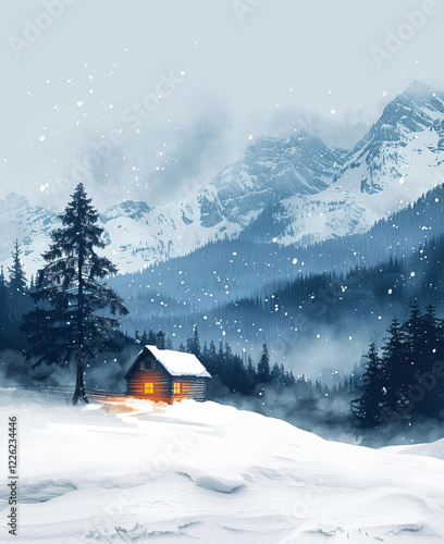 Naklejka premium Minimalist Winter Landscape: Snowy Mountains, Cozy Cabin with Glowing...