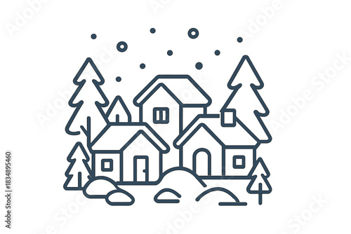 Fototapeta premium Minimalist winter village scene with houses, pine trees, and falling snow