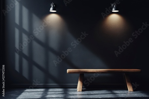 Obraz premium Minimalist wooden bench, dark wall, dramatic lighting, shadows, simple elegance, modern interior design, peaceful ambiance.