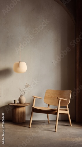 © paisorn, Fototapeta premium Minimalist Wooden Chair with Pendant Light and Natural Decor Elements