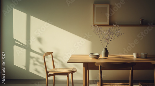 © Snezhana, Obraz premium Minimalist Wooden Dining Table with Vase and Natural Lighting